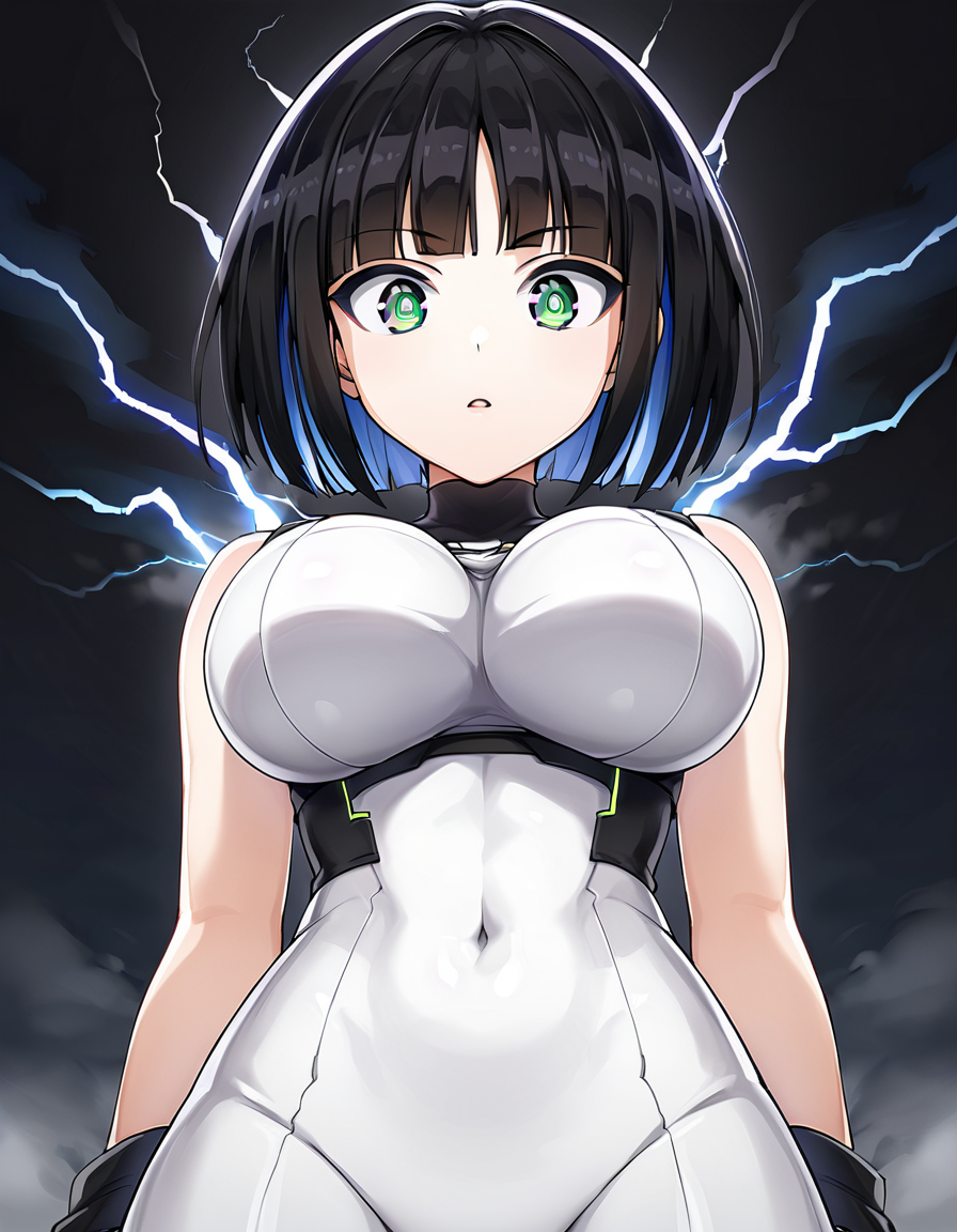 eines, crosshair pupils, black hair, short hair, bob cut, blunt bangs, colored inner hair, parted bangs, large breasts,