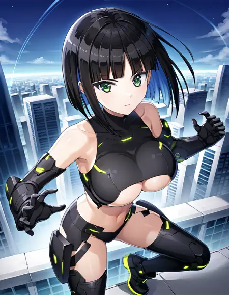 black swimsuit, underboob cutout, crop top, thigh boots, elbow gloves, midriff, navel, bare shoulders,