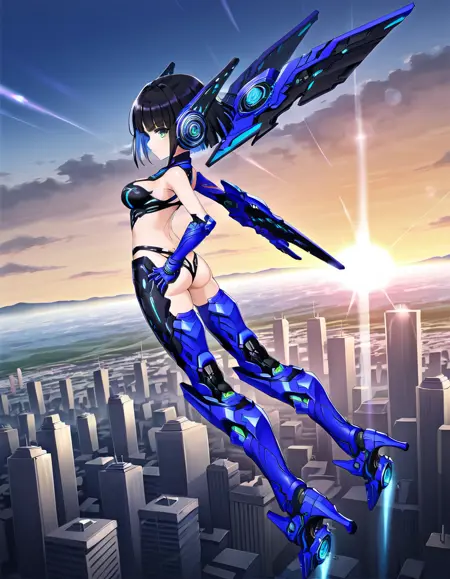 revealing clothes, bikini armor, mechanical ears, mechanical arms, mechanical legs, floating object, pasties, bare shoulders,