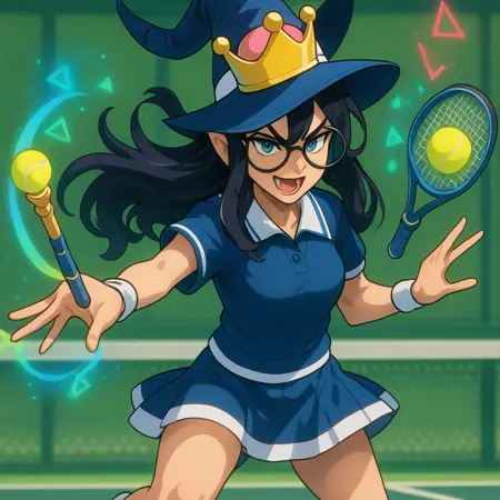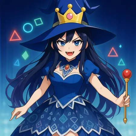 Kamette, fangs, witch hat, magic wand, geometric symbols, magic aura, super crown, black hair, dark blue eyes,