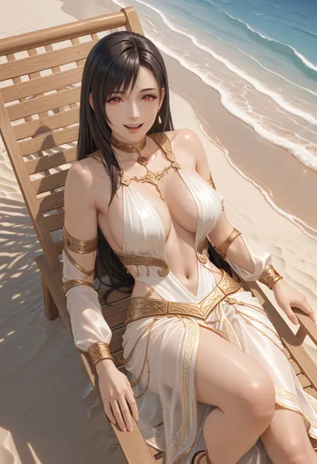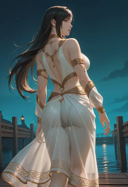 Base prompt: dermarinadoaxvv,choker,white dress,golden pattern,see-through,center opening,jewely,armlet,detached sleeves,navel,sandals