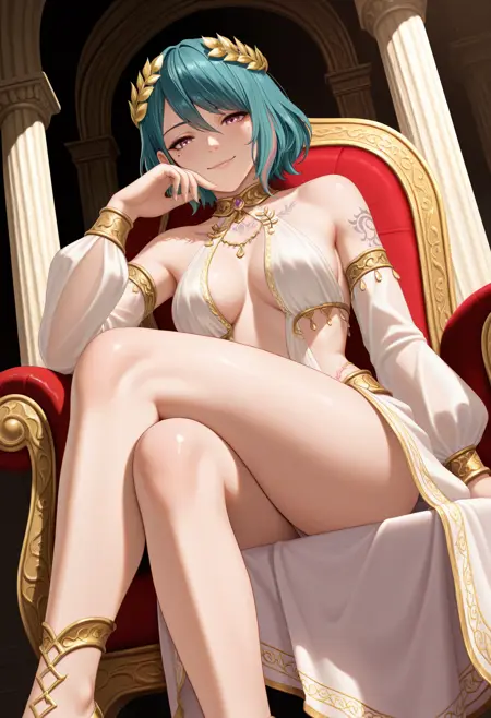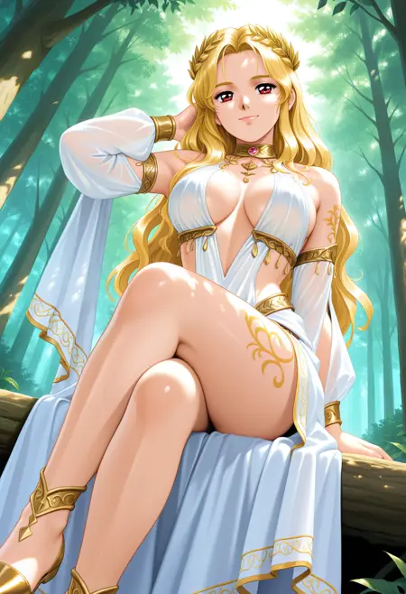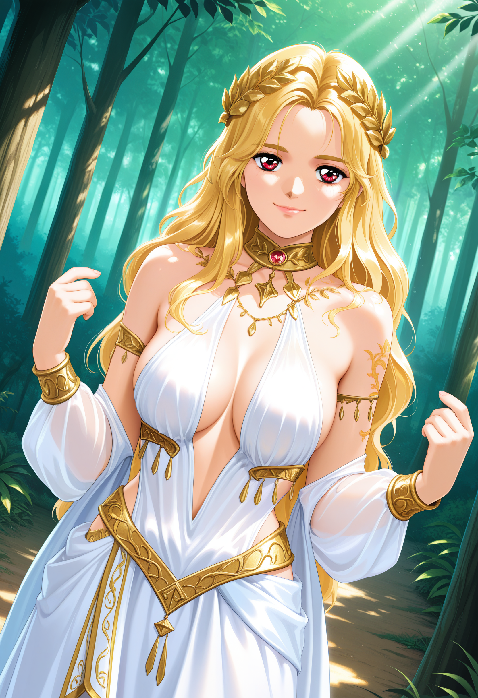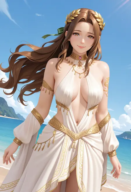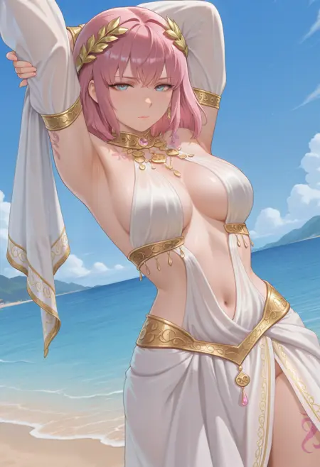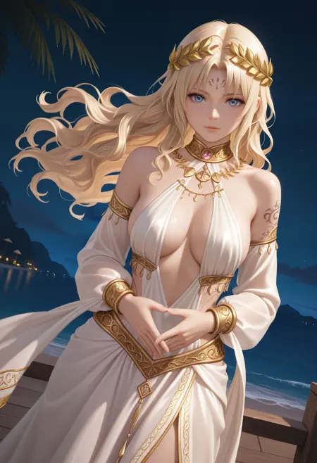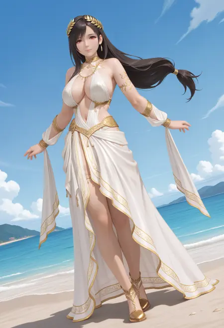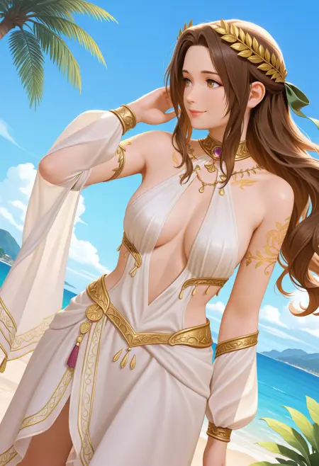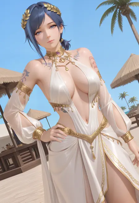Base prompt: dermarinadoaxvv,choker,white dress,golden pattern,see-through,center opening,jewely,armlet,detached sleeves,navel,sandals