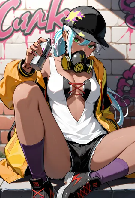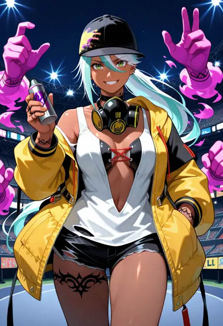 "ISL4XV,深色皮肤女性,棒球帽,双色头发,长发,马尾,绿眼睛,多个耳环,颈部围巾,防毒面具,黄色敞开夹克,短上衣,交叉系带服装,白衬衫,手部纹身,深V领,短裤,腿部纹身"