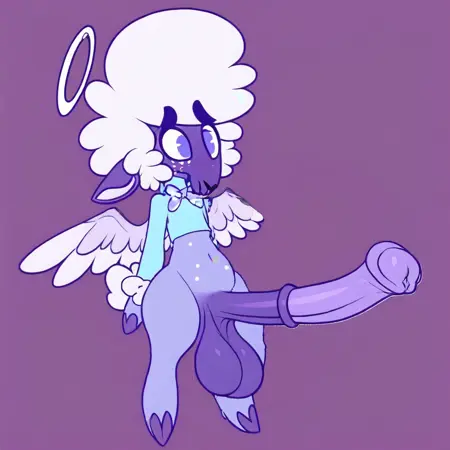 pale-periwinkle cotton tail, collin, cherub, sheep, anthro sheep, sheep cherub, small, short, dark-periwinkle skin, colored skin, tiny wings, small wings, cherub wings, hooves, pale-periwinkle hair, wool hair, periwinkle eyes, white sclera, pale-periwinkle freckles, periwinkle halo, purple nose, light periwinkle legs, two-toned periwinkle wings, dark periwinkle heart-shaped hooves, light periwinkle legs with white round markings, dark purple eyebrows, equine penis, massive penis, nude