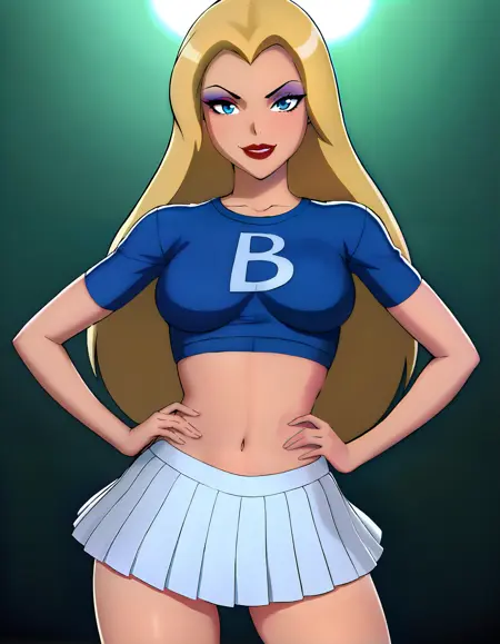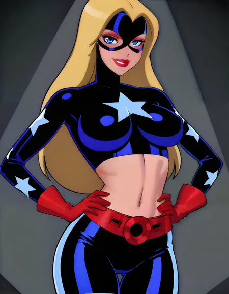 트리거: stargirldcau, 1girl, solo, 금발, 파란 눈, 긴 머리, 허리 노출, 슈퍼히어로, 립스틱, 메이크업, 슈퍼히어로, 크롭탑, 미소,