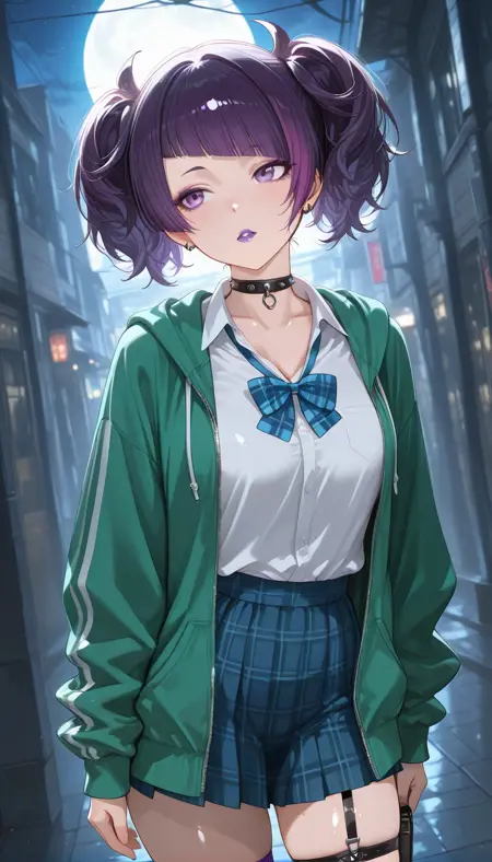 shirt, skirt, bow, twintails, jacket, school uniform, white shirt, open clothes, collared shirt, choker, bowtie, hood, open jacket, collar, plaid, hoodie, black choker, dress shirt, makeup, blue bow, plaid skirt, short twintails, lipstick, hooded jacket, eyeshadow, spikes, green jacket, blue bowtie, drawstring, plaid bow, purple lips, green hoodie, plaid bowtie, purple eyeshadow, loose bowtie, spiked choker, studded choker, hood down, wing collar, single thighhighs, long sleeves, collarbone, miniskirt, single garter straps, shirt tucked in, holster, purple thighhighs, thigh holster, belt, blue skirt, pocket, pouch, mismatched thighhighs,
