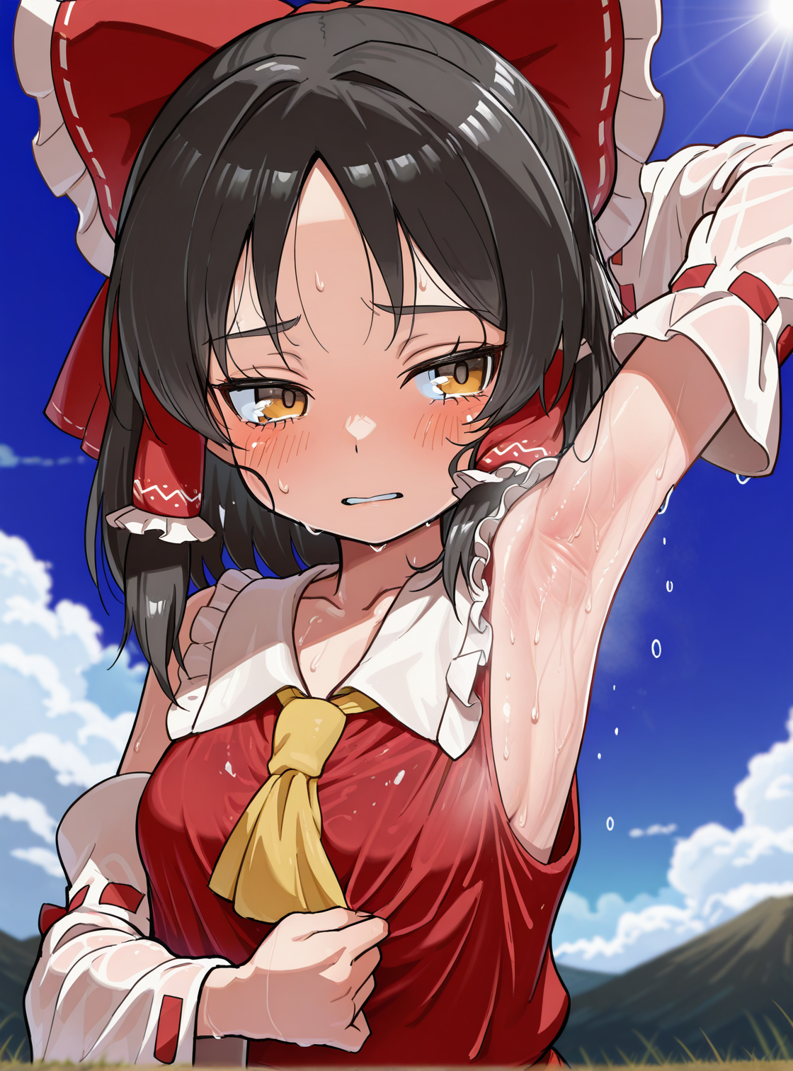 基础神社巫女服装:[[ 红色上衣,荷叶边裙子,红色裙子,可拆卸袖子,黄色领结,白色袖子,宽袖,缎带镶边袖子,露肩,白色领子,荷叶边领子,露脐 ]]