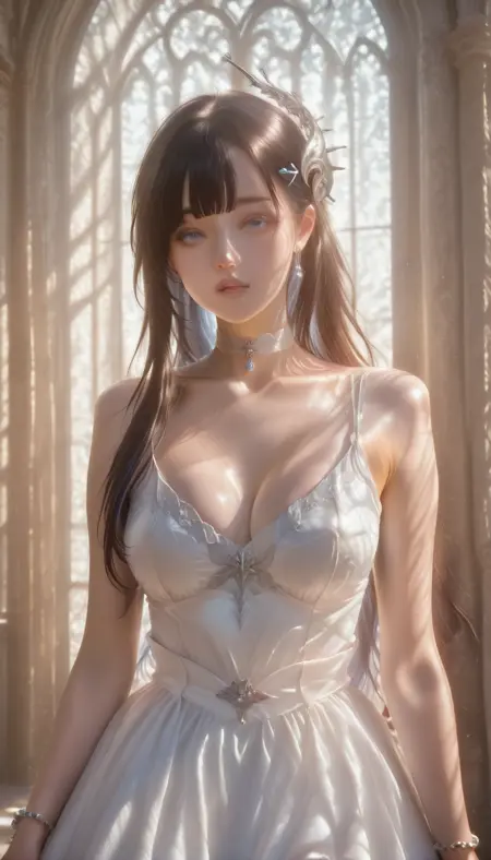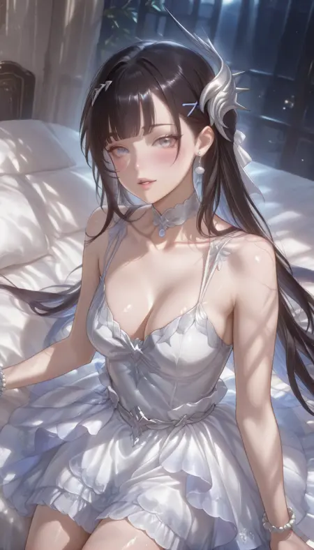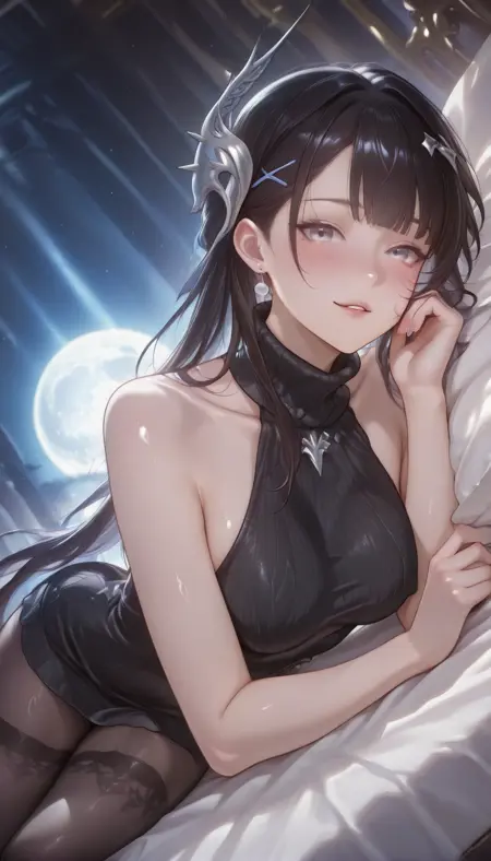 HSRHysilens、長髪、胸、黒髪、髪飾り、ジュエリー、非常に長い髪、中くらいの胸、紫色の目、複色の髪、イヤリング、開いた唇、ブランケットの前髪、ほくろ、灰色の目、目の下のほくろ、色付きの内毛、髪留め、非対称な髪飾り、真珠(宝石)、