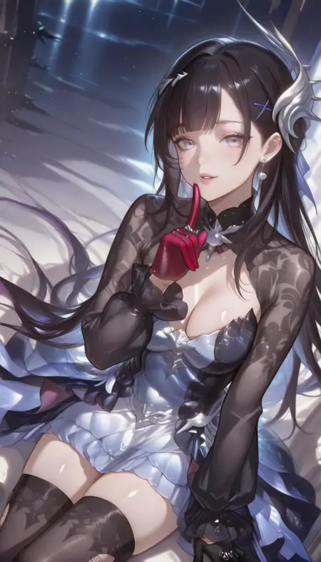 長袖、手袋、ドレス、太ももハイ、胸元、フリル、黒手袋、黒太ももハイ、黒ドレス、絶対領域、おへそカバー、青いドレス、短いドレス、フリル付きドレス、複色の服、赤手袋、ショール(服)、紫手袋、ハーフグローブ、ツートーンドレス、透けた袖、複色のドレス、太もも、透け、胸元カットアウト、ふくらはぎ袖、裂けた服、指輪、x髪飾り、宝石、裂けた太ももハイ、非対称な手袋、左右非対称な手袋、ツートーン手袋、紫宝石、茶色の太ももハイ、
