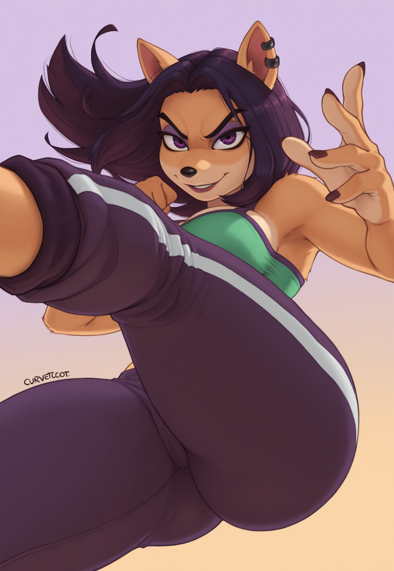1 girl, dark purple hair, Liz Bandicoot, purple eyes