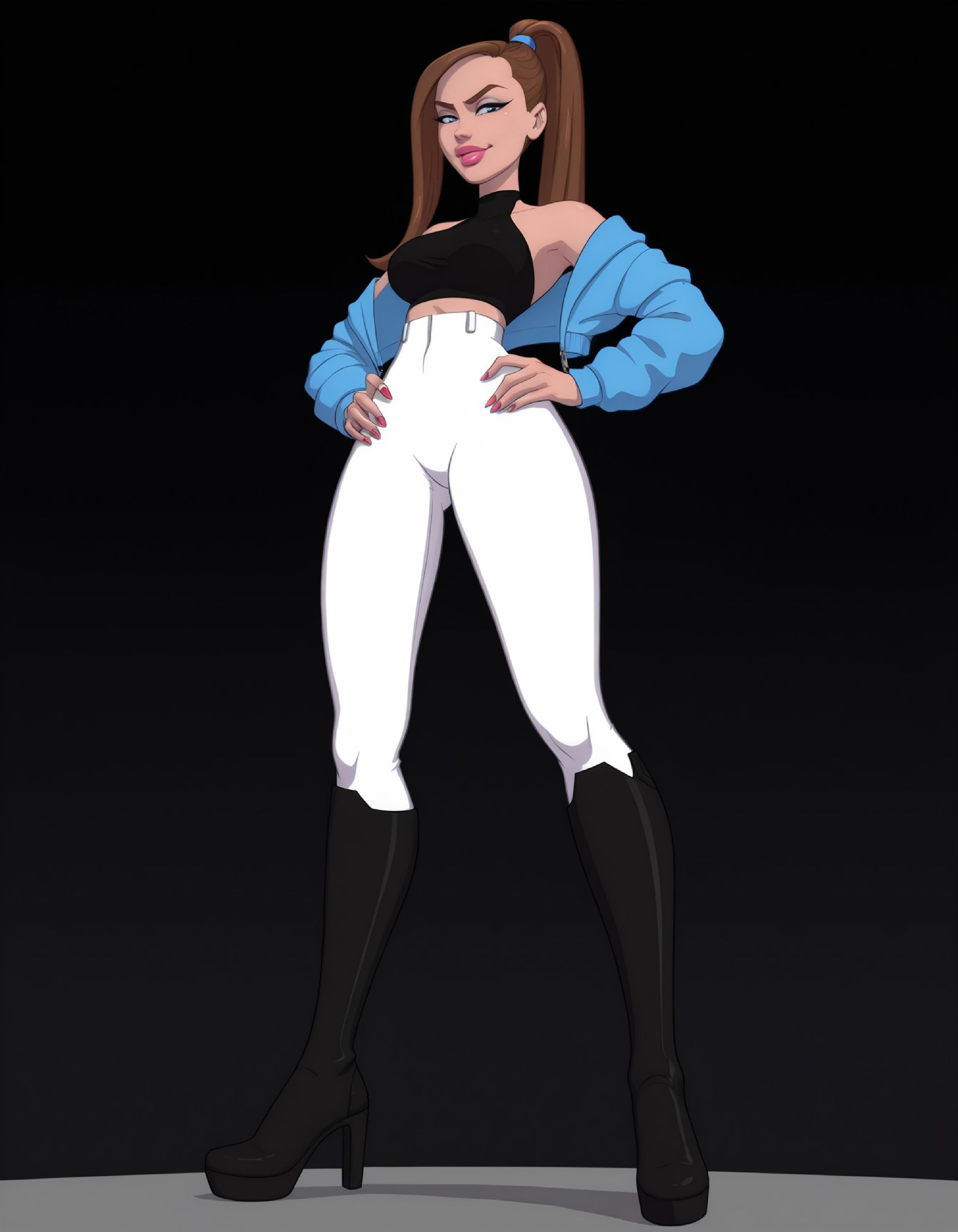 choker, cropped jacket, blue jacket, off shoulder, crop top, high-waist pants, white pants, knee boots, high heel boots