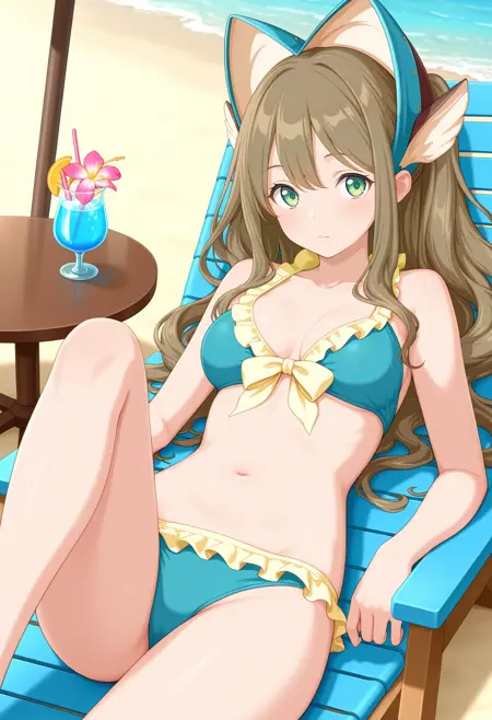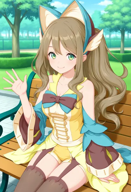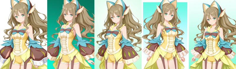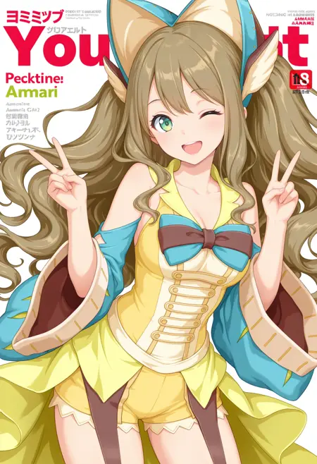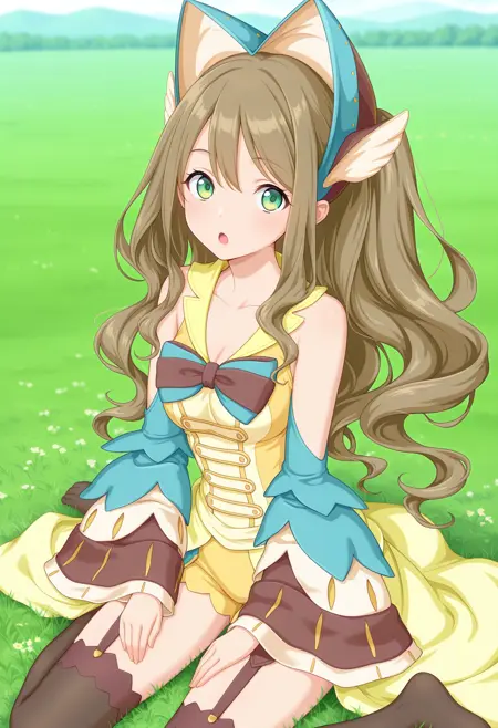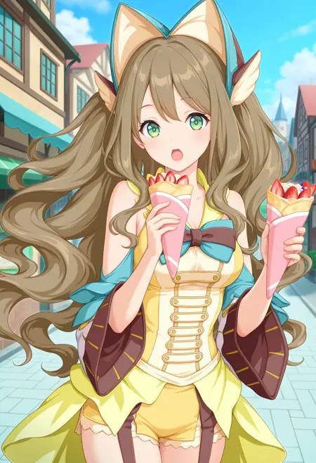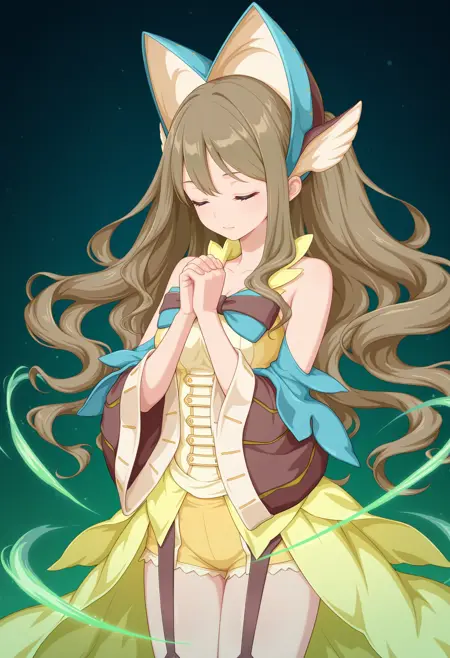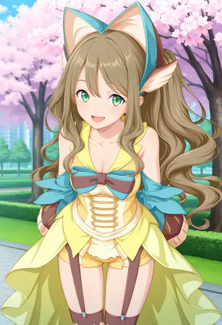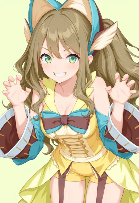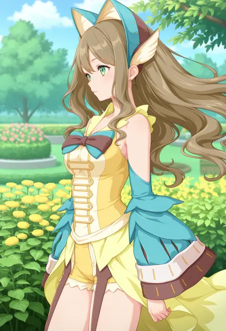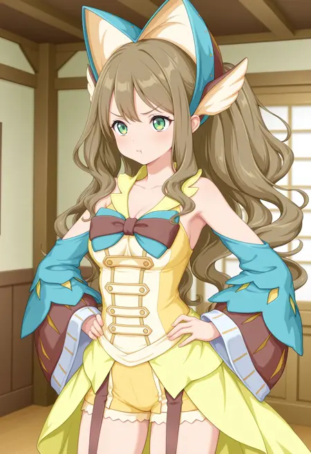 outfit1aaamari, long hair, brown hair, headdress, hair ornament, green eyes, bare shoulders, two-tone bowtie, yellow dress, detached sleeves, yellow shorts, garter straps