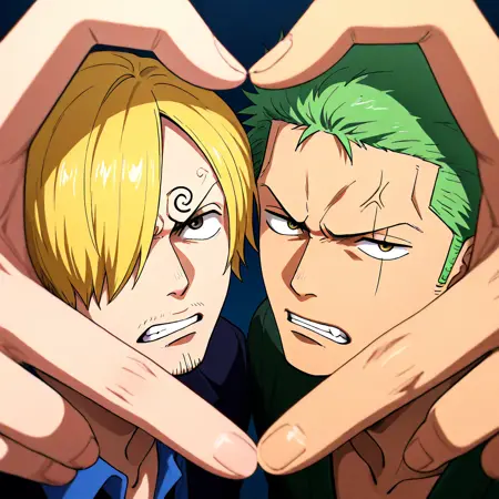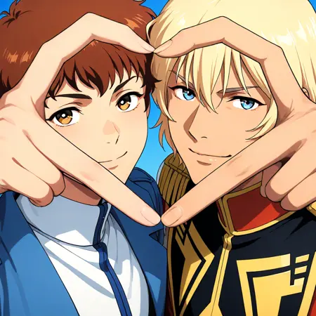 该LoRA在一种姿势上进行训练:两个角色用手指组成心形,并透过手指间的空隙看向观众。