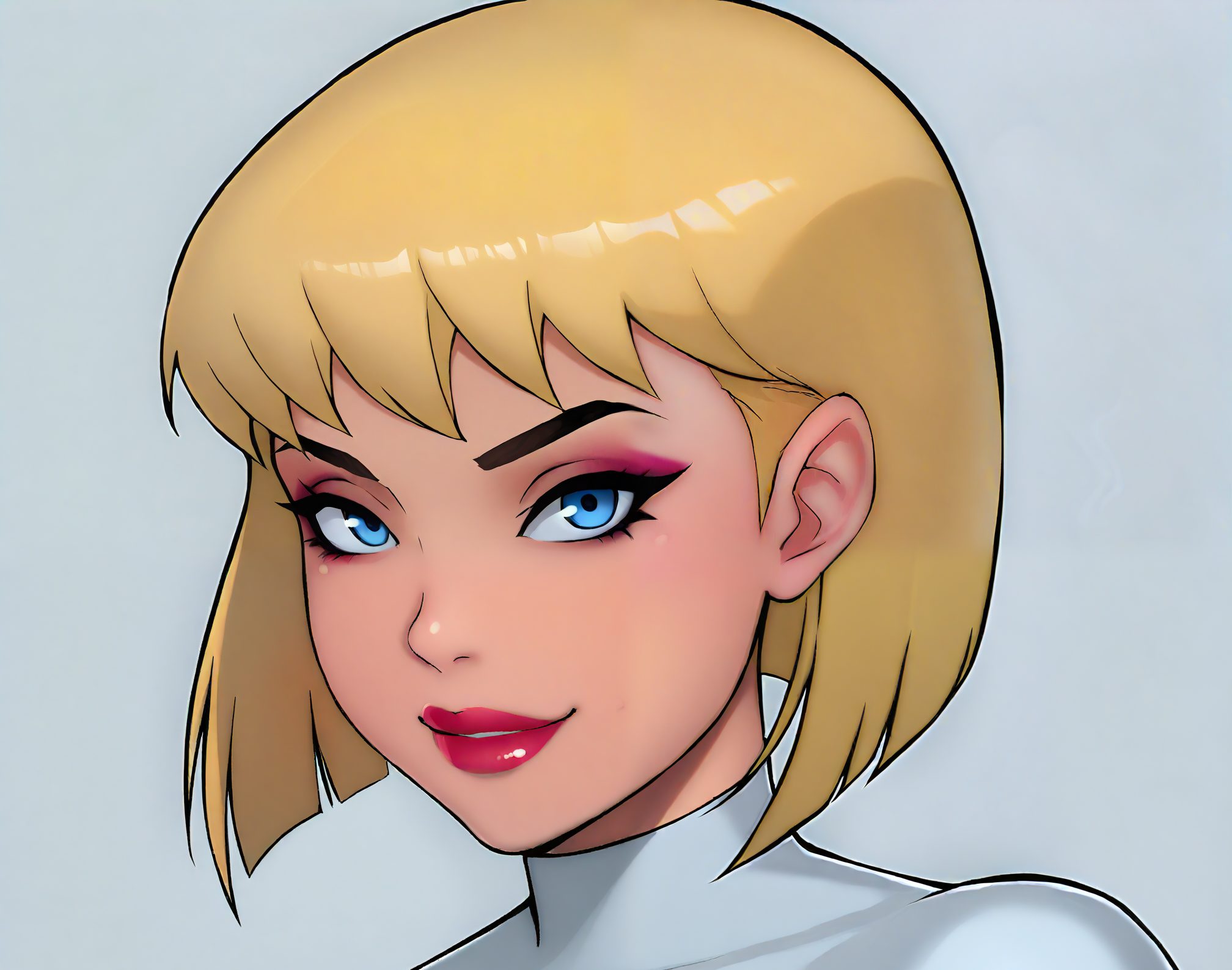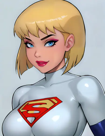 触发词:GalateaDCAU,1个女孩,单人,金发,蓝眼睛,露胸剪裁,短发,妆容,口红,微笑,白色紧身衣,手套,超级英雄