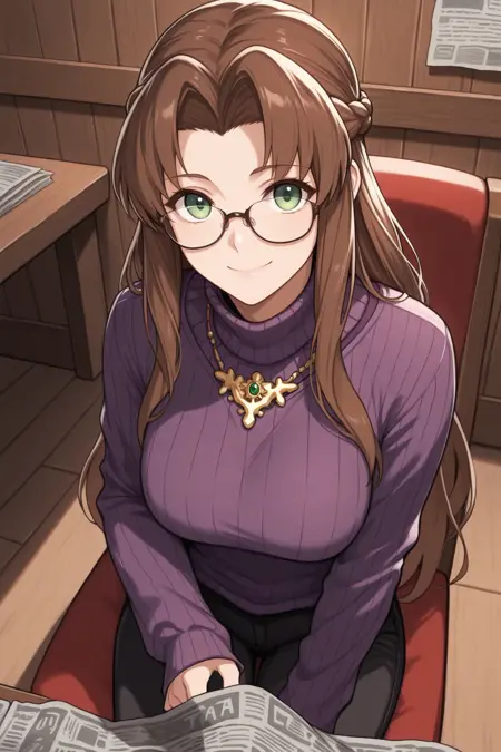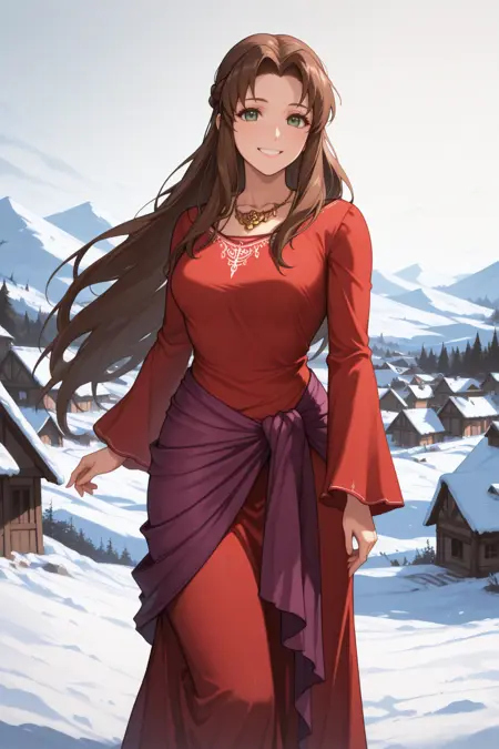 Add "necklace, red dress, long sleeves, purple sarong, long dress" for her typical look.