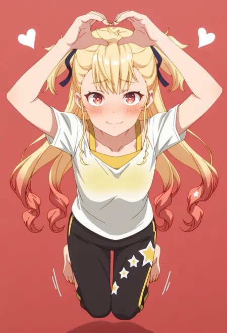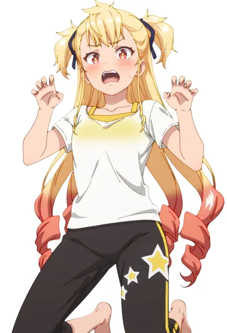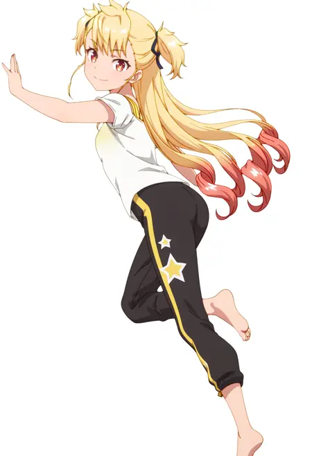 白いシャツ、服の下からブラが見える、スポーツブラ、ブラのストラップ、黄色のブラ、鎖骨、縦一筋の模様、星のプリント、スウェットパンツ、黒いパンツ、黄色の靴