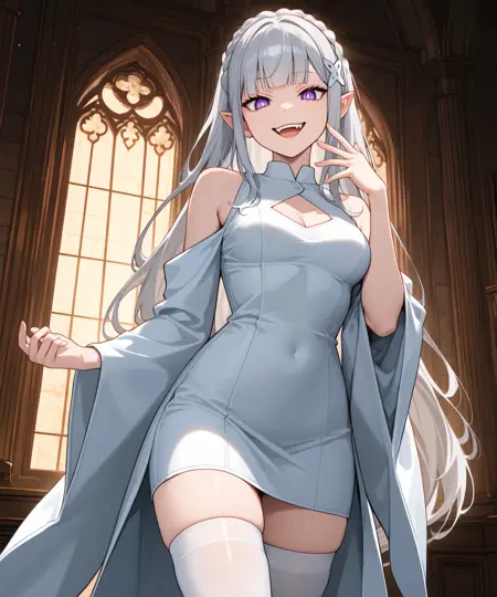 卡佩拉:Em1l14,EmCap,白色长裙,三角形露胸剪裁,白色及大腿高筒袜,裸露肩部,肩部露空,长袖,宽袖,白色袖子,x 发饰,(若生成出紫色装饰,请在负面提示中添加:"紫色镶边,多彩服装")