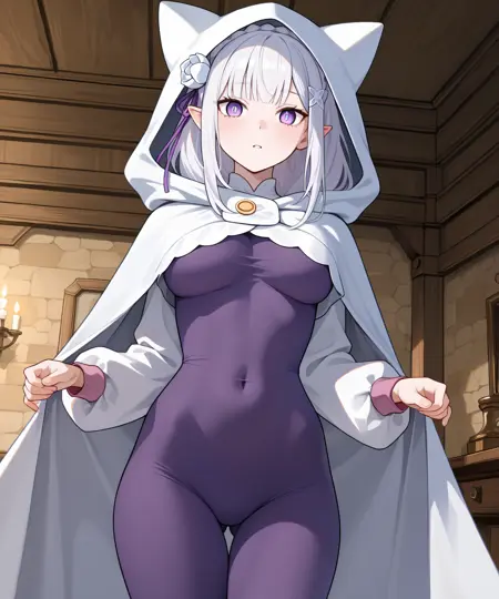 第四季:Em1l14,EmS4,紫色紧身衣,白色斗篷,胸扣(可选:戴帽,猫耳帽,不可能紧身衣,紧贴皮肤。如不想要光泽感,请在负面提示中加入:"闪亮,乳胶")
