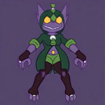 Tags: gnawlyn, solo, full body, 1girl, furry, pokemon (creature), purple skin, yellow eyes, no pupils, sharp teeth, grin, hood, coat, sleeves rolled up, zipper pull tab, navel cutout, elbow gloves, fingerless gloves, claws, green shorts, thighhighs, toeless legwear, fewer digits