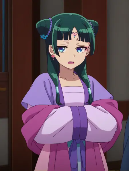 cartoon screencap in rm artstyle. the character has cartoonish bodily proportions with a small head relative to body height, big round eyes with small pupils and small mouth, and a small simplified nose. she has long dark green hair styled into two buns with strands hanging down, wearing a pink and purple hanfu-style robe with a long blue waist sash.