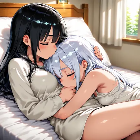This LoRA assists in generating a situation where one woman kisses another woman's hair/head.