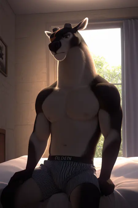 To get him without antlers, try no antlers, antlerless, or put antlers in your negative prompt.
