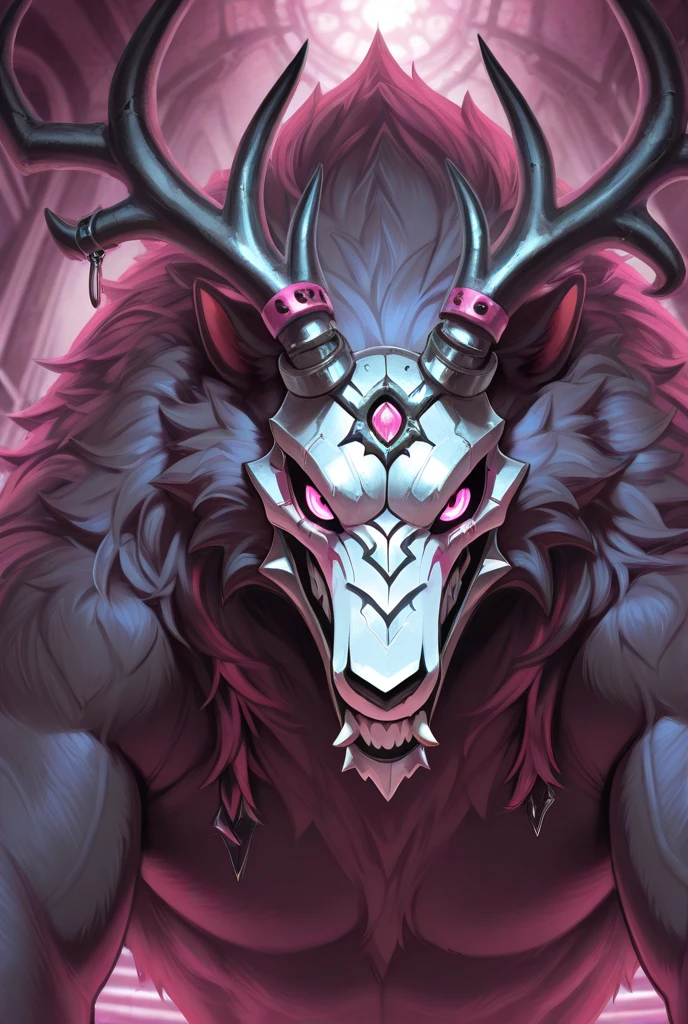 Pierced VB, animal skull head, dark antlers, glowing pink eyes, purple aura, tattoo, antlers ornament, furry, muscular, bara, thick thighs, large pectorals, muscular male
