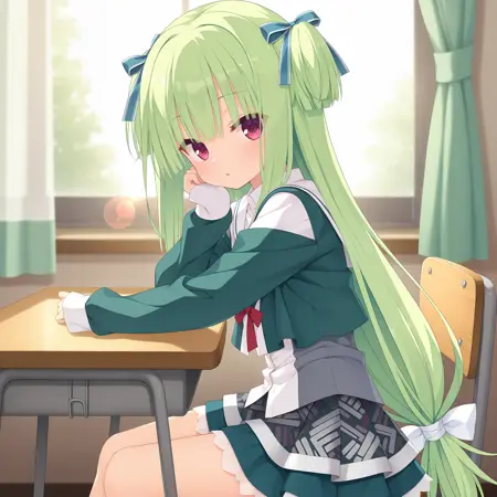 two side up,hair ribbon,blue ribbon,low-tied long hair,hair bow,white bow,school uniform,miniskirt,white shirt,long sleeves,cropped jacket,pleated skirt,white sailor collar,sleeves past wrists,frilled skirt,red bow,green jacket,green skirt,collared jacket,layered skirt,print skirt,white frills,grey skirt,