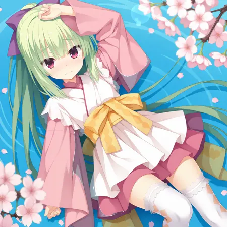 high ponytail,hair bow,purple bow,pink kimono,layered kimono,white thighhighs,wide sleeves,argyle legwear,layered sleeves,white kimono,yellow sash,yellow bow,waist bow,short over long sleeves,frilled thighhighs,argyle thighhighs,frilled kimono,white skirt,pink skirt,layered skirt,miniskirt,