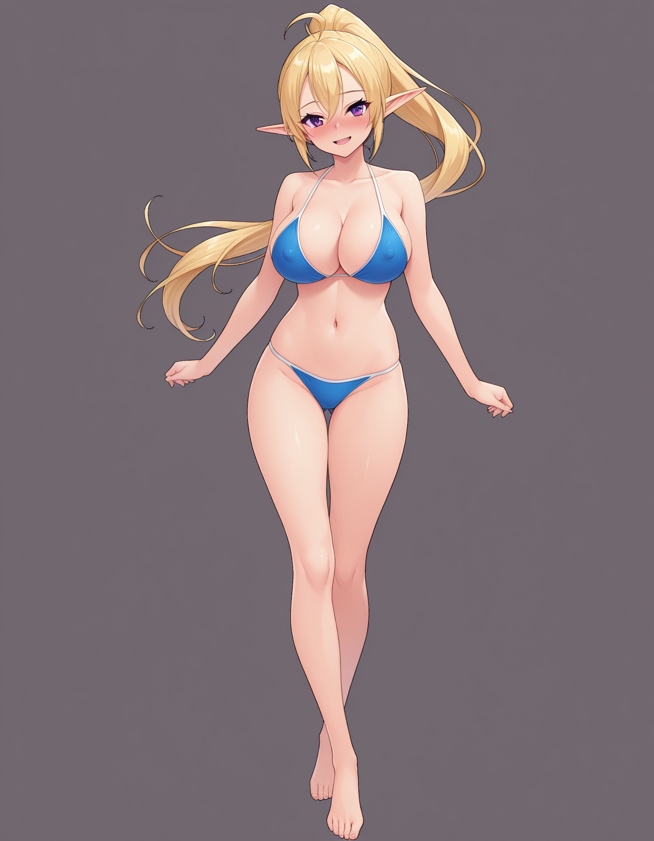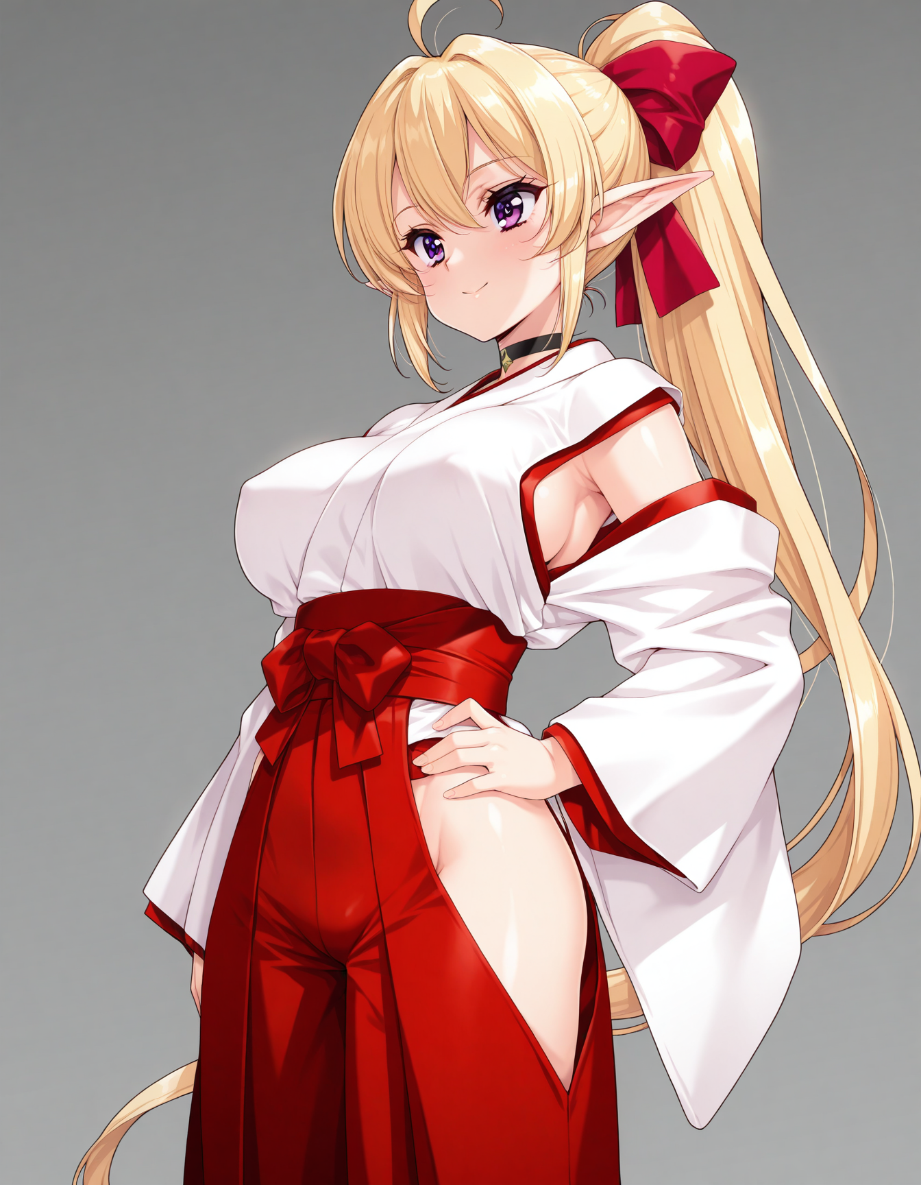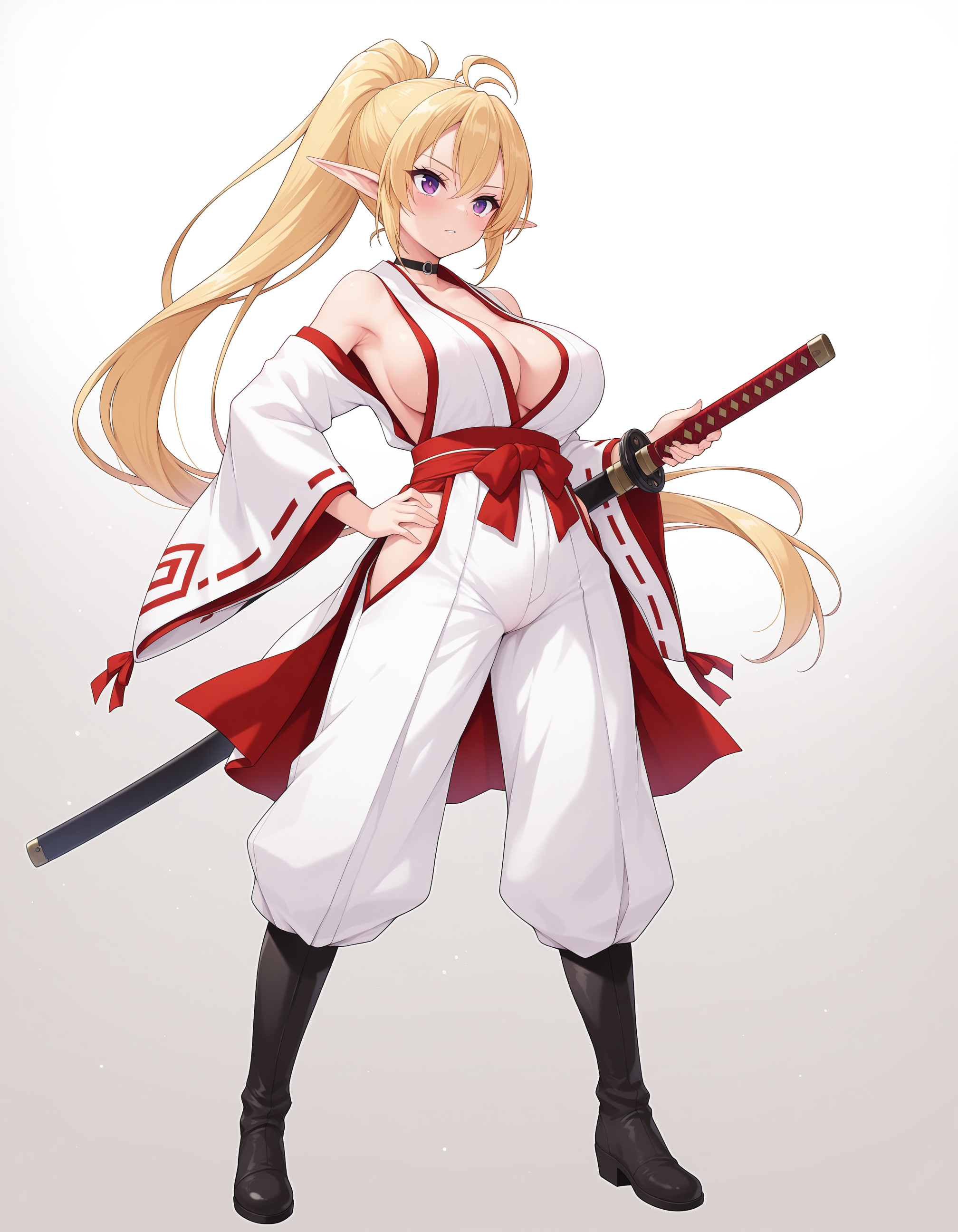 1girl,mai_fn,mai_fn_e,elf,large_breasts,blonde_hair,very_long_hair,ponytail,ahoge,purple_eyes,barefoot,pointy_ears,miko,katana,White pants,black boots