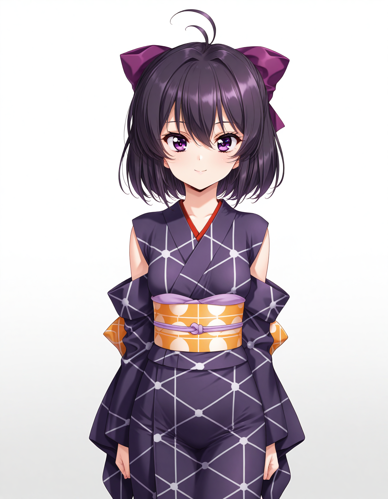 1girl,mai_fn,mai_fn_p,1girl,solo,short_hair,black_hair,hair_between_eyes,ahoge,purple_eyes,purple_hair,medium_hair,hair_bow,small_breasts,japanese_clothes,kimono,detached_sleeves,purple pattern,obi,sash,thighs,black_shorts,bike_shorts,katana