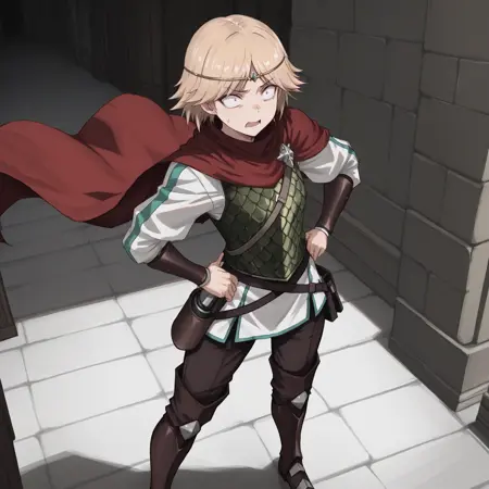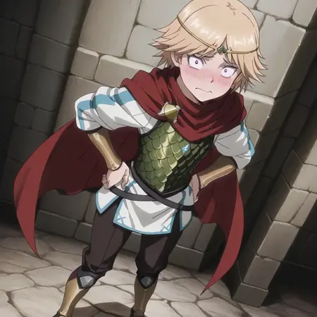 nazarick armor: nazarick armor, green armor, white shirtt, red cape, brown pants, bracers, knee boots, visor, circlet, scale armor