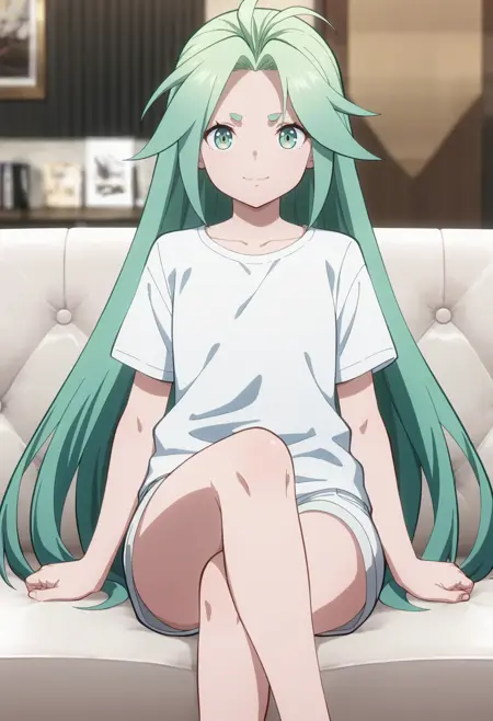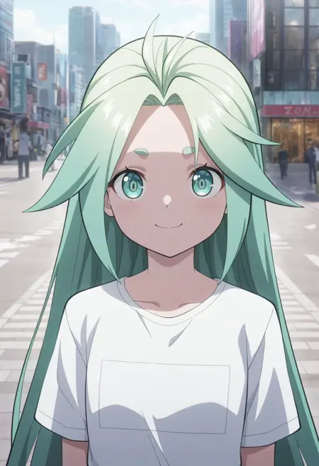 예시 프롬프트: zcx, green hair, smirk, looking at viewer, white shirt, white shorts, cowboy shot, gradient background