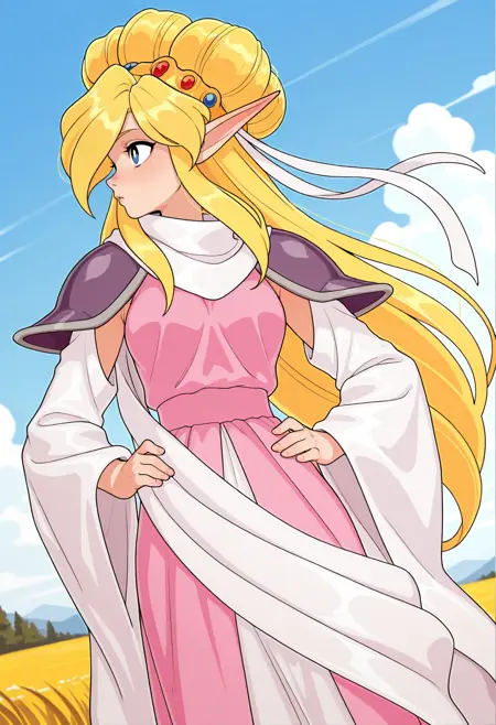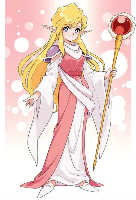 Otaya, 1girl, 솔로, 금발, 매우 긴 머리, 머리묶음, 단일 머리묶음, 파란 눈, 하얀 동공, 뾰족한 귀, 스카프, 어깨보호대, 드레스, 분리된 소매, 넓은 소매, 긴 소매, 중간 크기의 가슴, 띠, 리본, 레트로 아트스타일,