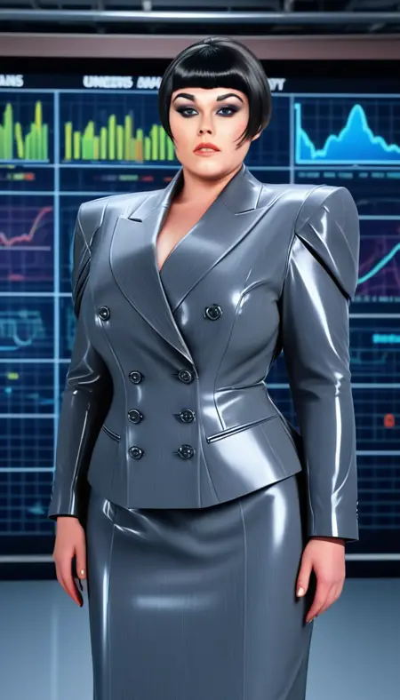 Denise. A curvy lady with a futuristic bob haircut. Completely fictitious; not based on any real person or character. Images generated mainly from AI video stills.