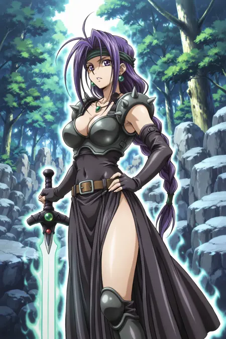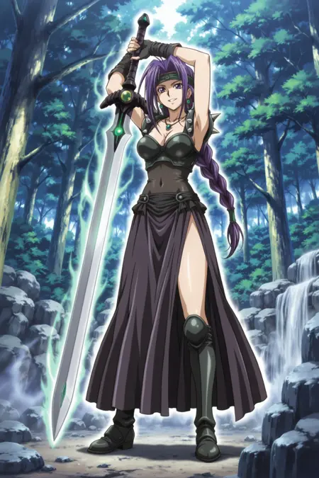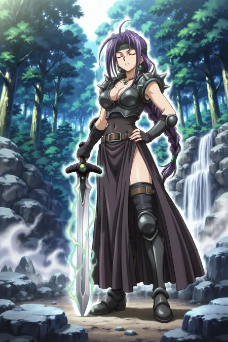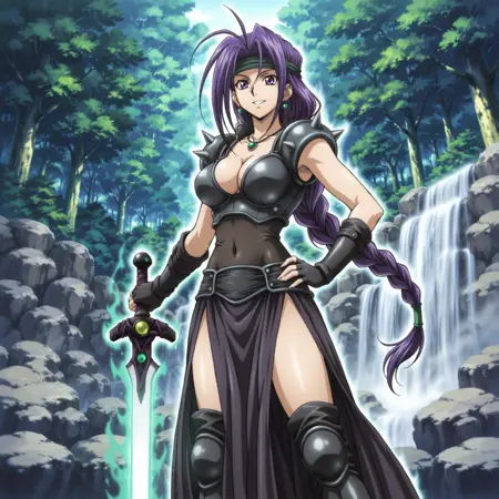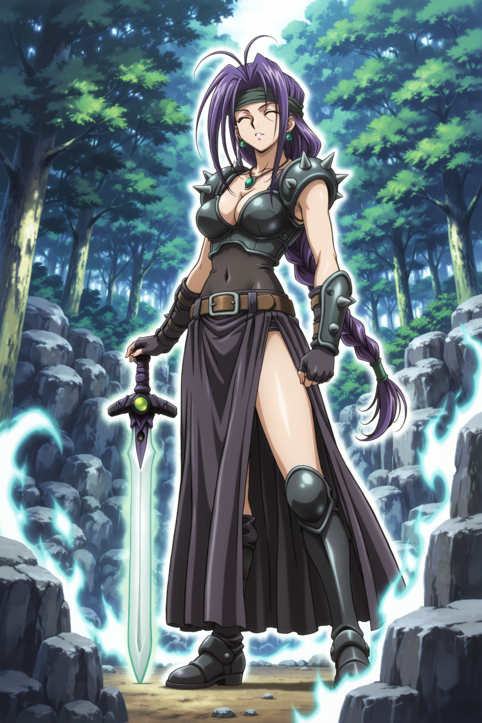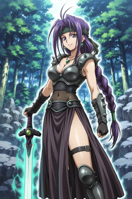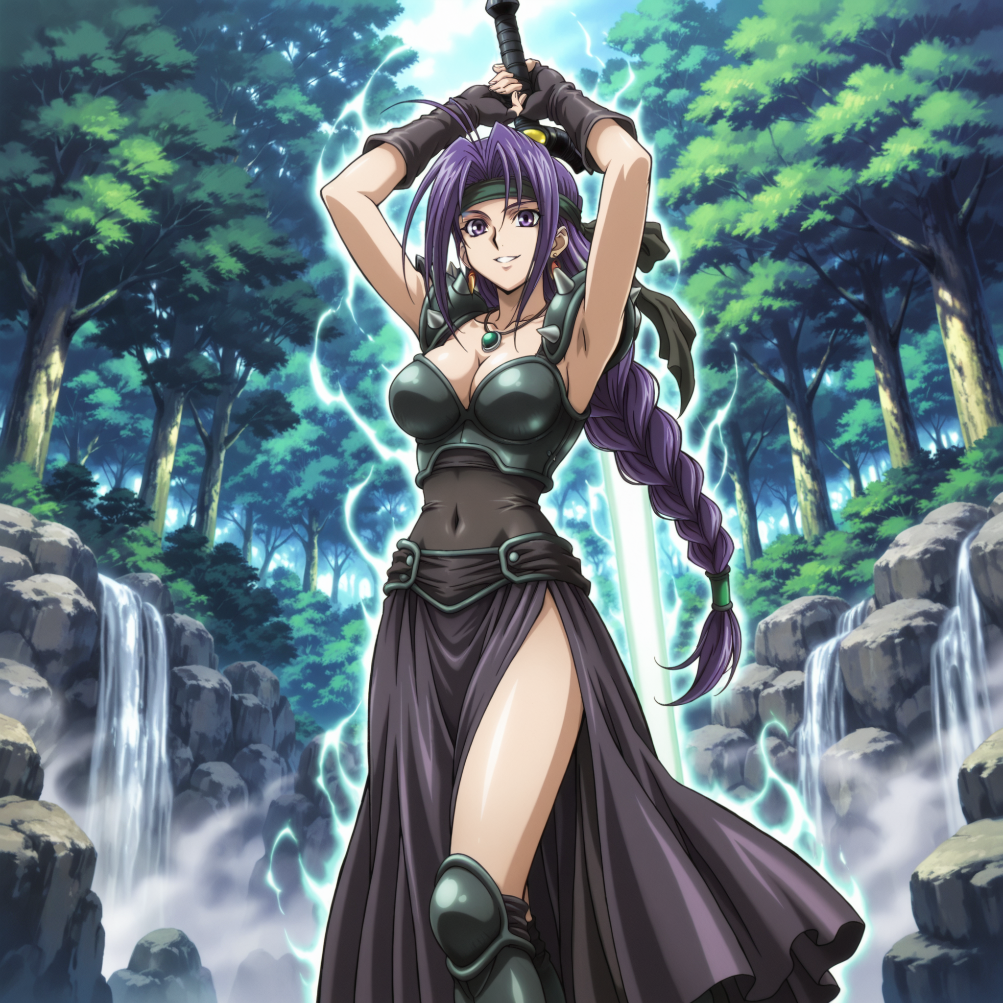 yugioh_card_style, yugioh_card_for_the_unfriendly_amazon, バイオレットアイズ, ヘッドバンド, 紫色の髪, 長い髪, 一本編み, 片耳イヤリング, ネックレス, 大きな胸, 锁骨, 裸のへそ, 胸元, 笑顔, 腕なしの鎧トップ, 黒レザーのコルセット, 銃剣付き鎧, 指なしグローブ, 太ももスリットスカート, レイヤードスカート, 布製のベルト, レッグハイズ, 太ももまでの鎧ブーツ, 剣, 長剣, 光る剣, 紫色の柄, 柄に緑の宝石, 一片手剣グリップ