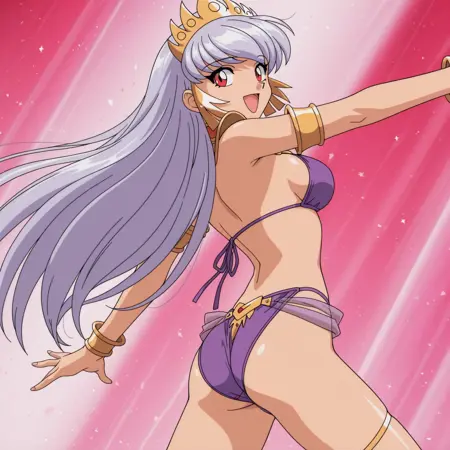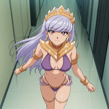 use tags like " lapyrinth of flames, erola, long hair, jewelry, red eyes, grey hair, crown, bracelet,, armlet, bikini, swimsuit, purple bikini, see-through
