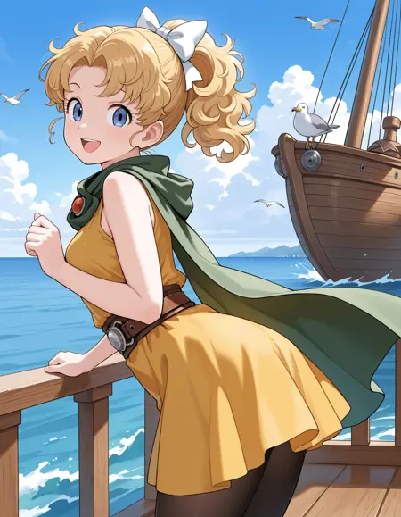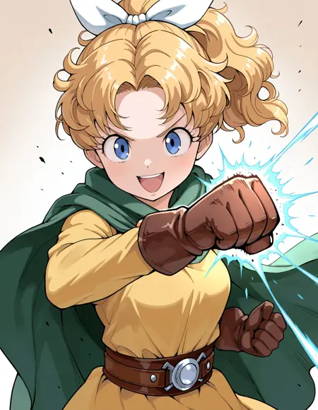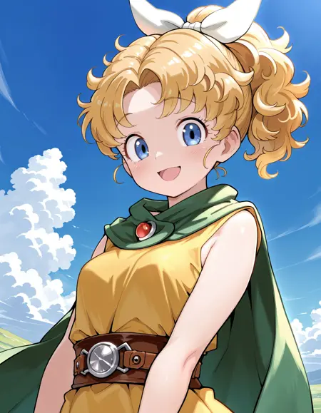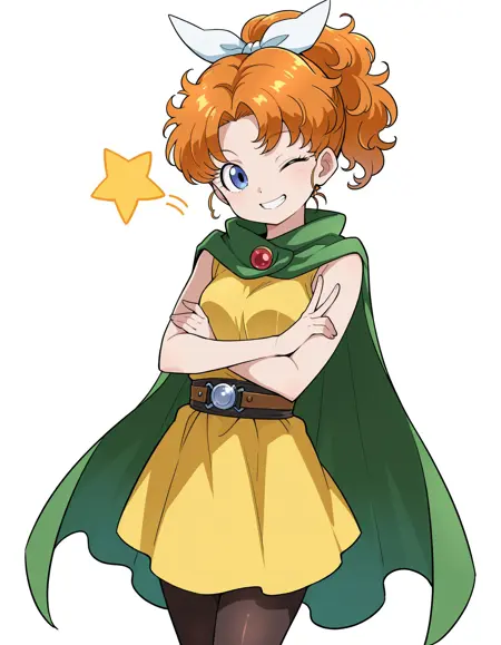 그녀의 전형적인 외모를 위해 "주황색 머리(blrond hair), 곱슬머리, 헤어 리본, 녹색 망토, 노란색 드레스, 소매 없는 드레스, 갈색 벨트, 벨트 버클, 팬티스타킹, 무릎 부츠"를 추가하세요.(IllustriousXL_v2.0)