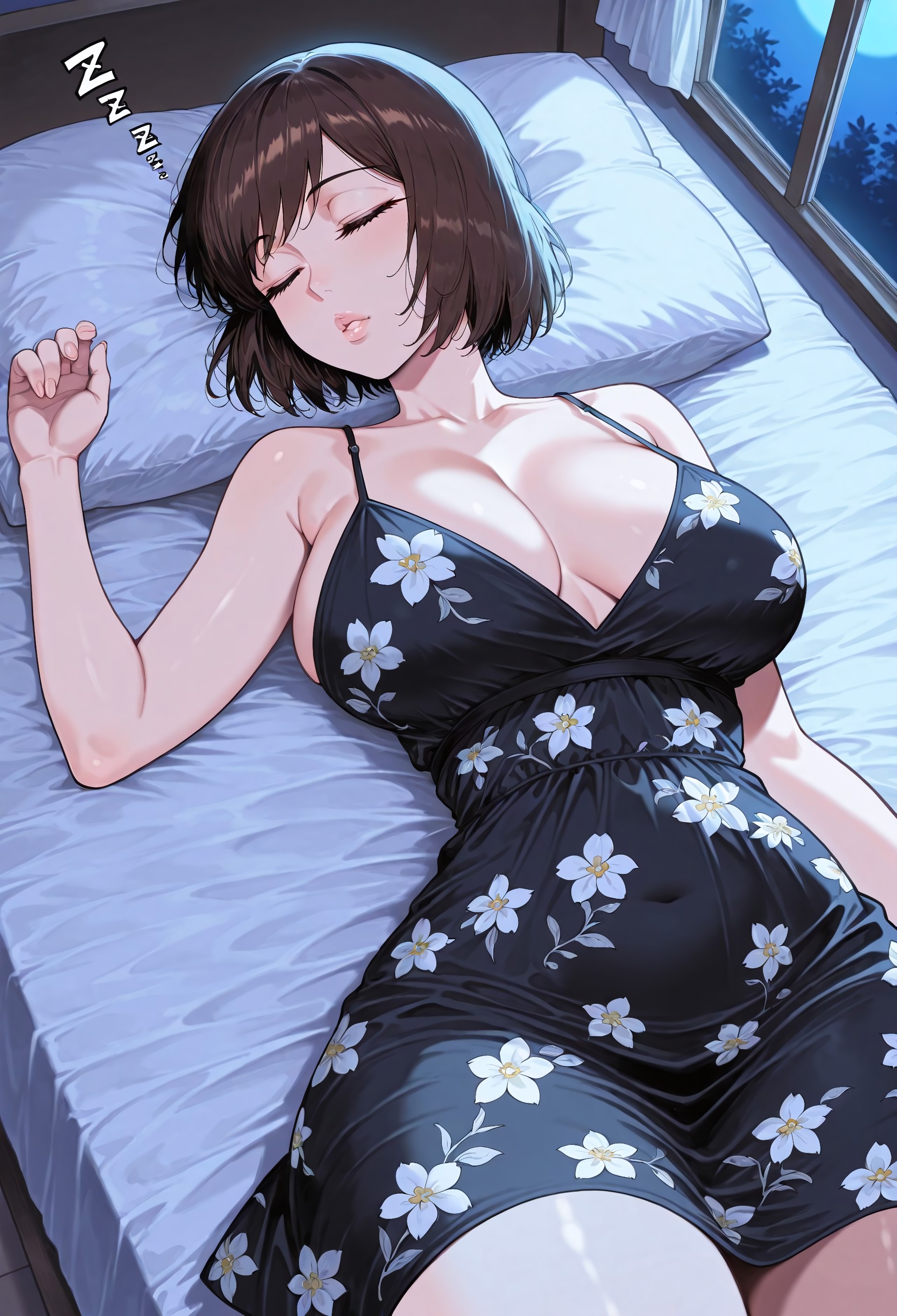 1girl, solo, short hair, brown hair, pink eyes, lips, collarbone, cleavage, large breasts, navel, midriff, navel, groin,