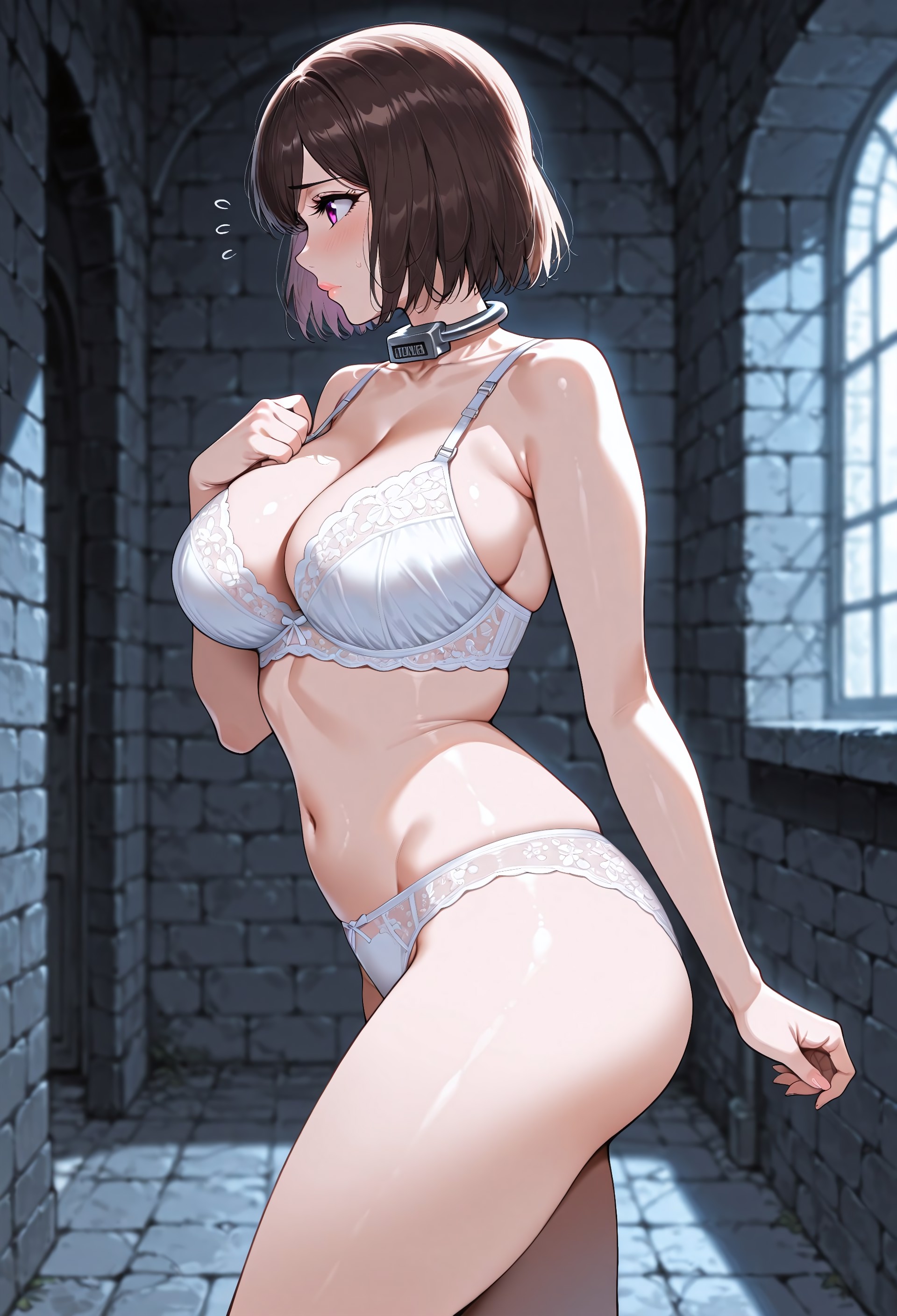 metal collar, underwear only, white bra, white panties, lace, barefoot