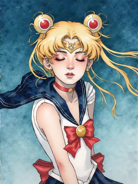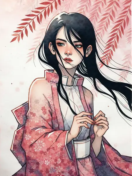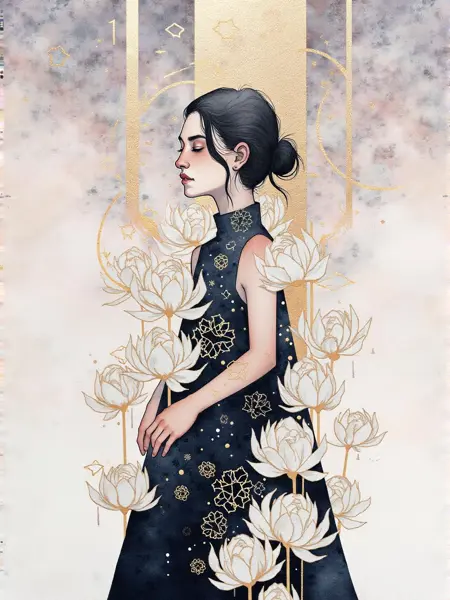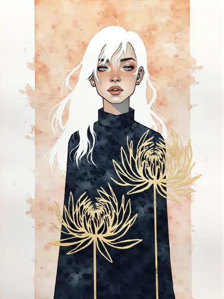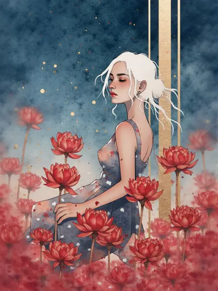 Lora allows you to create art in the style of Kelogsloops (Hieu Nguyen). Distinctive features of the style ,watercolor, gouache, white line, gold leaf, watercolor paper texture, watercolor illustration , gold outline
