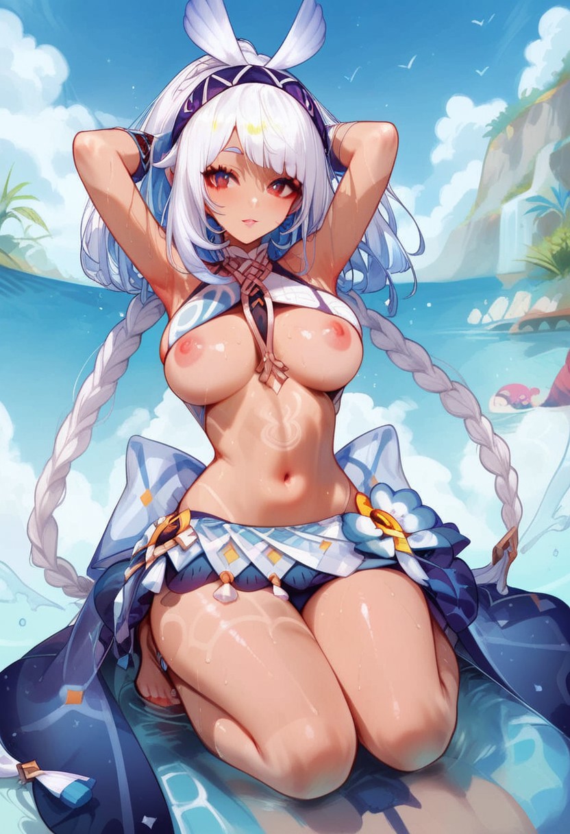 (Genshin_Mualani, long hair, braid, bangs, white hair, red eyes, dark-skinned female, hairband, fingerless gloves, swimsuit, skirt),