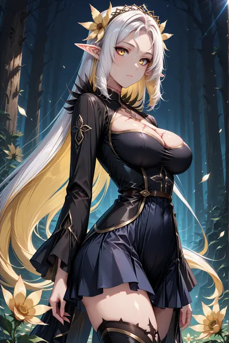 태그: 다색 머리카락, 흰색 머리카락, 노란색 머리카락, 머리카락 꽃, 엘프, 긴 머리, 검은 드레스, 허벅지 부츠