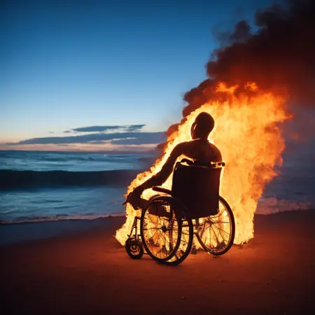 トレーニングプロンプト:実写風の写真、砂浜にいる車椅子の男性が完全に炎に包まれている、遠くで波が打ち寄せる、夜、後方から撮影