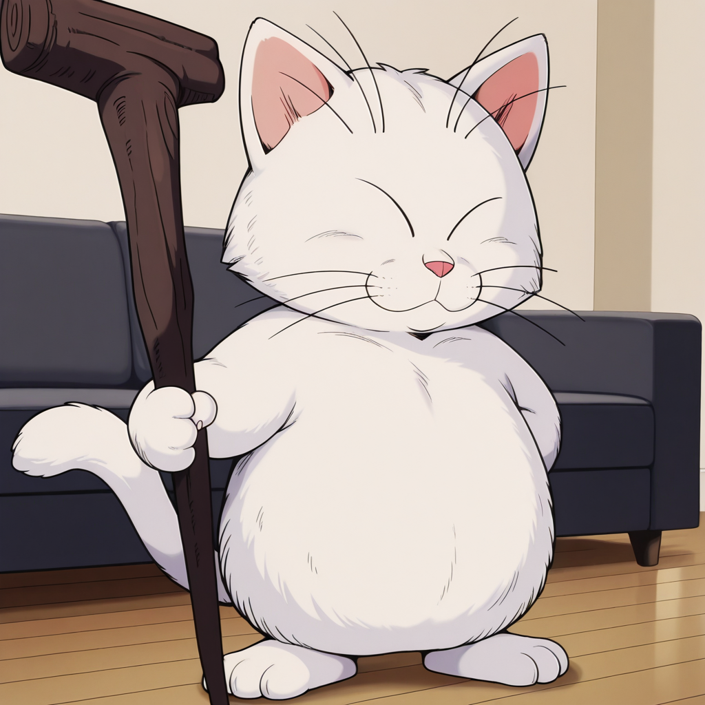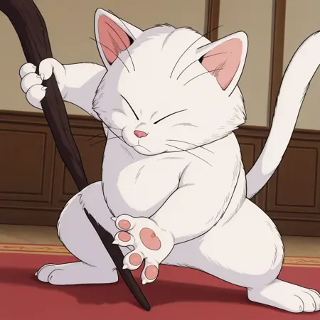 Trigger words: male, furry male, anthro, solo, cat, white fur, closed eyes, whiskers, pink nose, cat ears, pink inner-ears, ear tufts, sharp nails, pawpads, tail, wooden staff