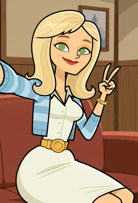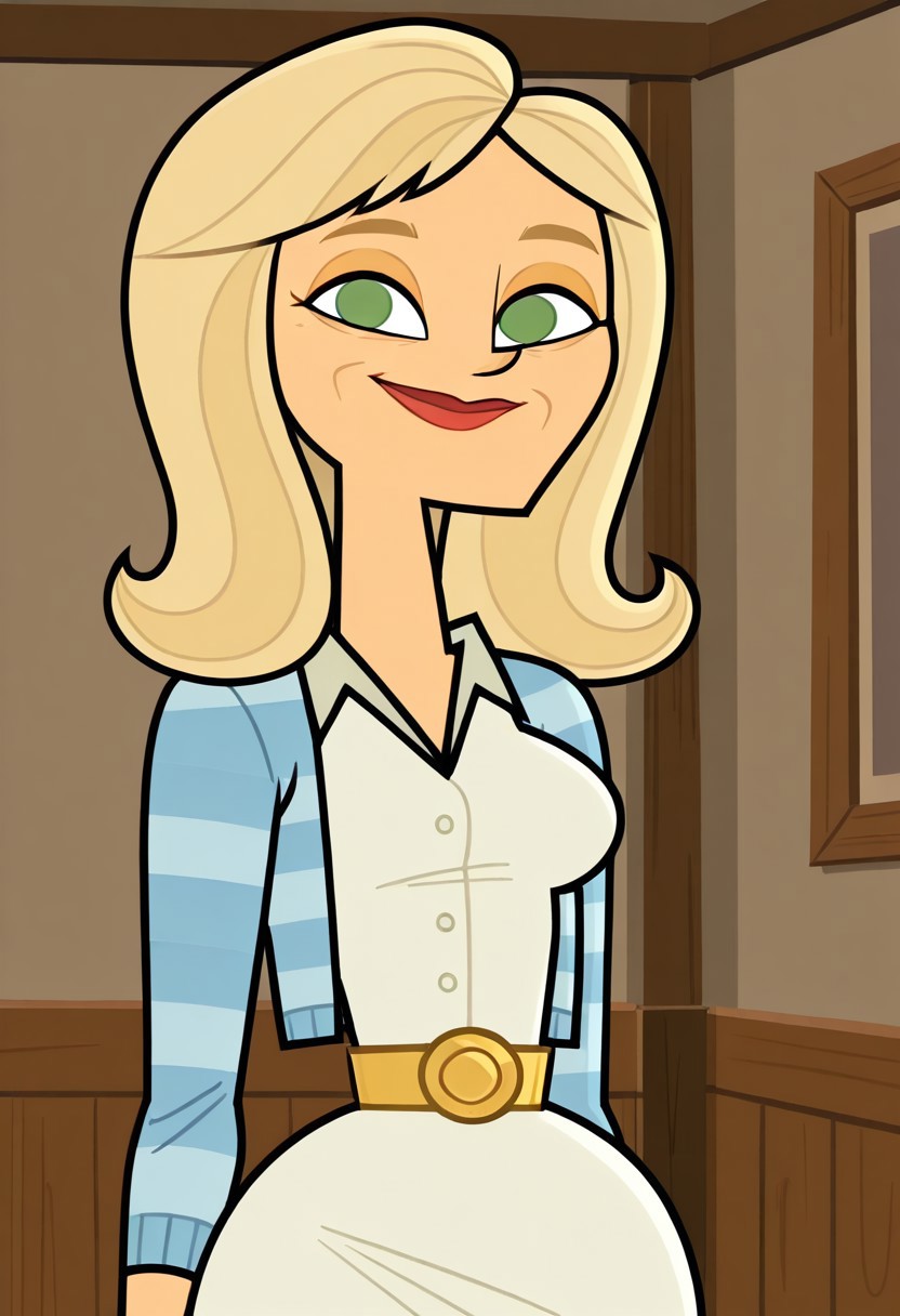 トリガー語: 1girl, solo, Lynda_DC, 白い肌, 緑の目, 薄い金色の髪, 肩までの髪, サンディーエイシャドウ, リップスティック
