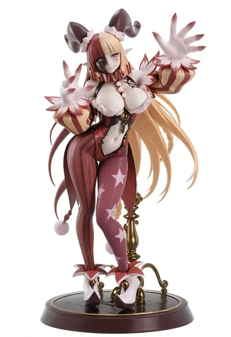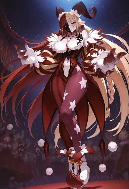 jester outfit, long dress, half mask, black mask, neck ruff, bare shoulders, pom pom necklace, cleavage, oversized gloves, navel cutout, striped sleeves, vertical-striped legwear, mismatched legwear, pantyhose, white footwear, pointy footwear, star print