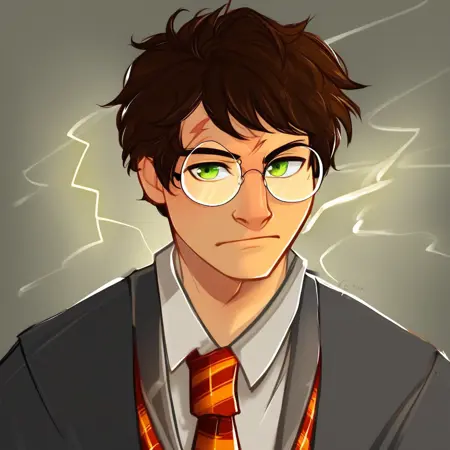 h4r0ld jam3s p0t, male, forehead scar, lightning scar, glasses, green eyes, Brown hair, short hair, gryffindor uniform, Necktie