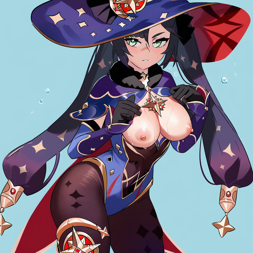 (Genshin_Mona, long hair, twintails,black hair, green eyes, gloves, leotard, pantyhose, thighlet, witch hat),