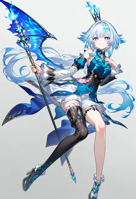 1girl, two-tone hair,white hair,patterned hair,diamond print,diamond_\(shape\),mini crown,blue fire on crown,low_ponytail,blue eyes,hair bow,french braid